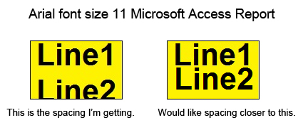 I’m using Microsoft Access 2016 (Microsoft Office 2016) to create reports on Windows 10. The design of my report requires that I get a single text string to wrap into two lines in a predefined space (yellow box) on the report. What I’m seeing using Arial font is that there is a lot of space in between lines when a text box or label automatically wraps to two lines. I need this wrapping because I don’t want to try to create separate text boxes or labels. I would like to reduce this space so that I can go with the largest font possible and still get both lines inside the box.