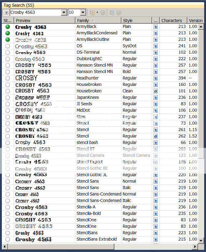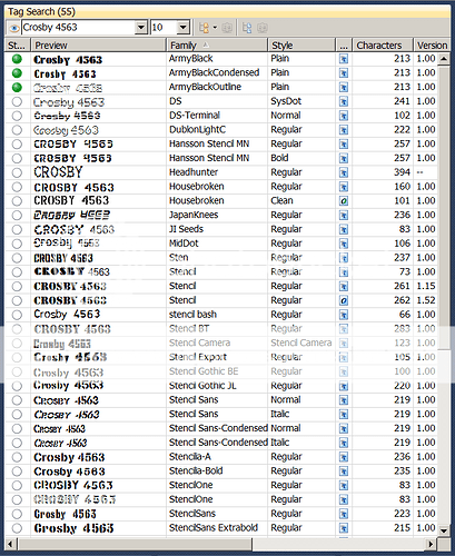 Using MainType I was able to quickly isolate 55 stencil fonts from my 142,000 (otherwise impossible to look at), typed my name and address message in to examine each of them and reject those without numbers, no lower case, too difficult to cut out, or -just not me.