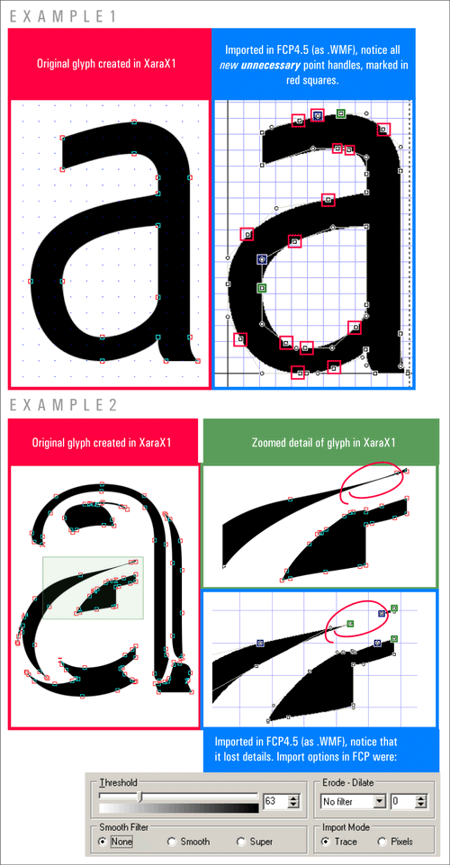 Then some people wanted the greater power of a graphics program to draw using tools they were used to, so Erwin added WMF import. If you want to take that route, that’s fine, but don’t complain that the WMF import doesn’t perfectly match your originals. Font Creator’s internal format for vector curves is not WMF. It uses Quadratic Bezier Curves — the same format as that used by Truetype fonts — rather than the Cubic Bezier Curves used by vector drawing programs and Postscript Type One fonts.