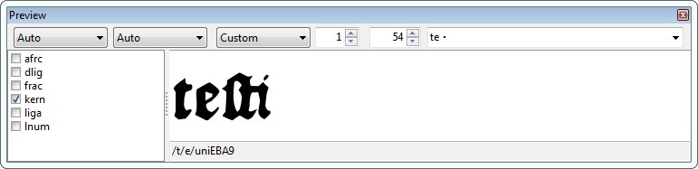 For the most part, I’m quite happy to see that the kerning looks pretty reasonable (even with rather limited pair adjustments – indeed, almost none at all on the main glyphs, but mostly just on some of the ligatures in my PUA). The bulk of the kerning issues that I had cleared up had to do with fixing the spacing between those PUA ligatures and whatever characters came