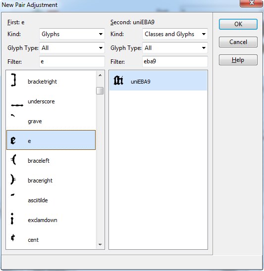 Okay, I’m trying very hard to do this kerning thing right this time – I think it was a combined effort of miscommunication on Bhikkhu’s part and misunderstanding on my part in why I went off in the wrong direction with this before. In entering into this (as a newbie) I assumed – perhaps naively, but not unnaturally – that when creating a font, at a certain point (when you’re reasonably happy with your glyphs) you run autokern, first, and then you start tweaking your kerning from there, whether that’s by making additional adjustments to those now-already-existing pairs, or else adding in additional pairs that autokerning didn’t take into account (like one’s PUA glyphs).