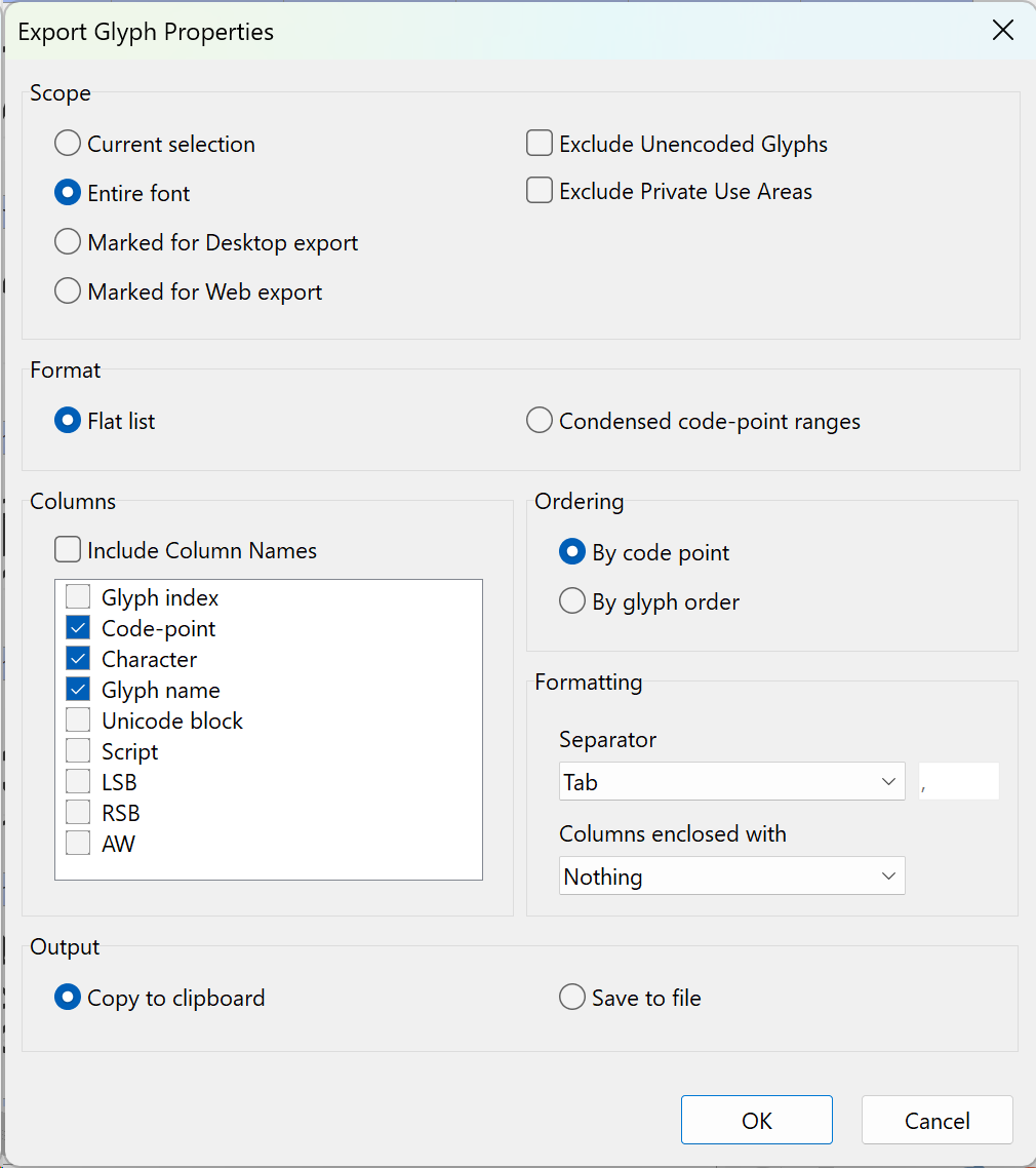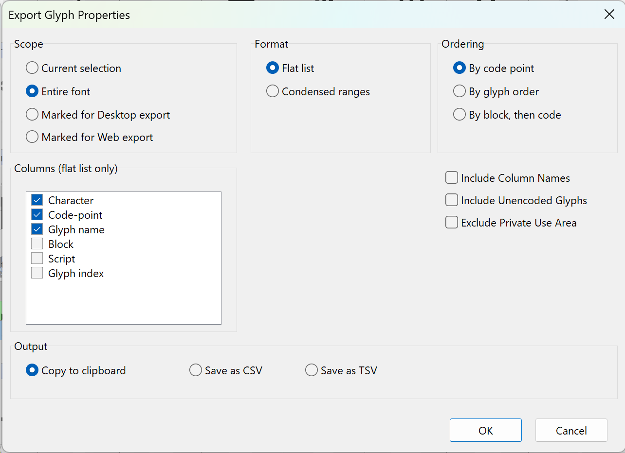 It would be great if the Export menu had an additional section where you could export the selected characters’ (ctrl-A for all) code points. Right now ctrl-C copies the glyph names, but I don’t need those. I need a list of all Unicode code points included in the font. It could be located underneath Tools > Glyph Names option.