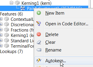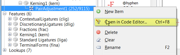 Select the kerning adjustment pairs lookup and right-click to open it in the code editor. Some prefer to work in the code editor, but the visual designer makes things a lot easier for the average user.