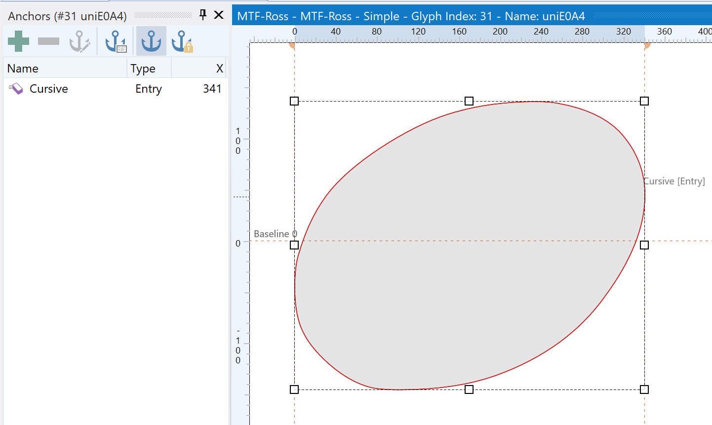 I tried creating anchor points in FontCreator, but clearly I don’t know what I’m doing there. Here’s all I was able to create, “cursive”: