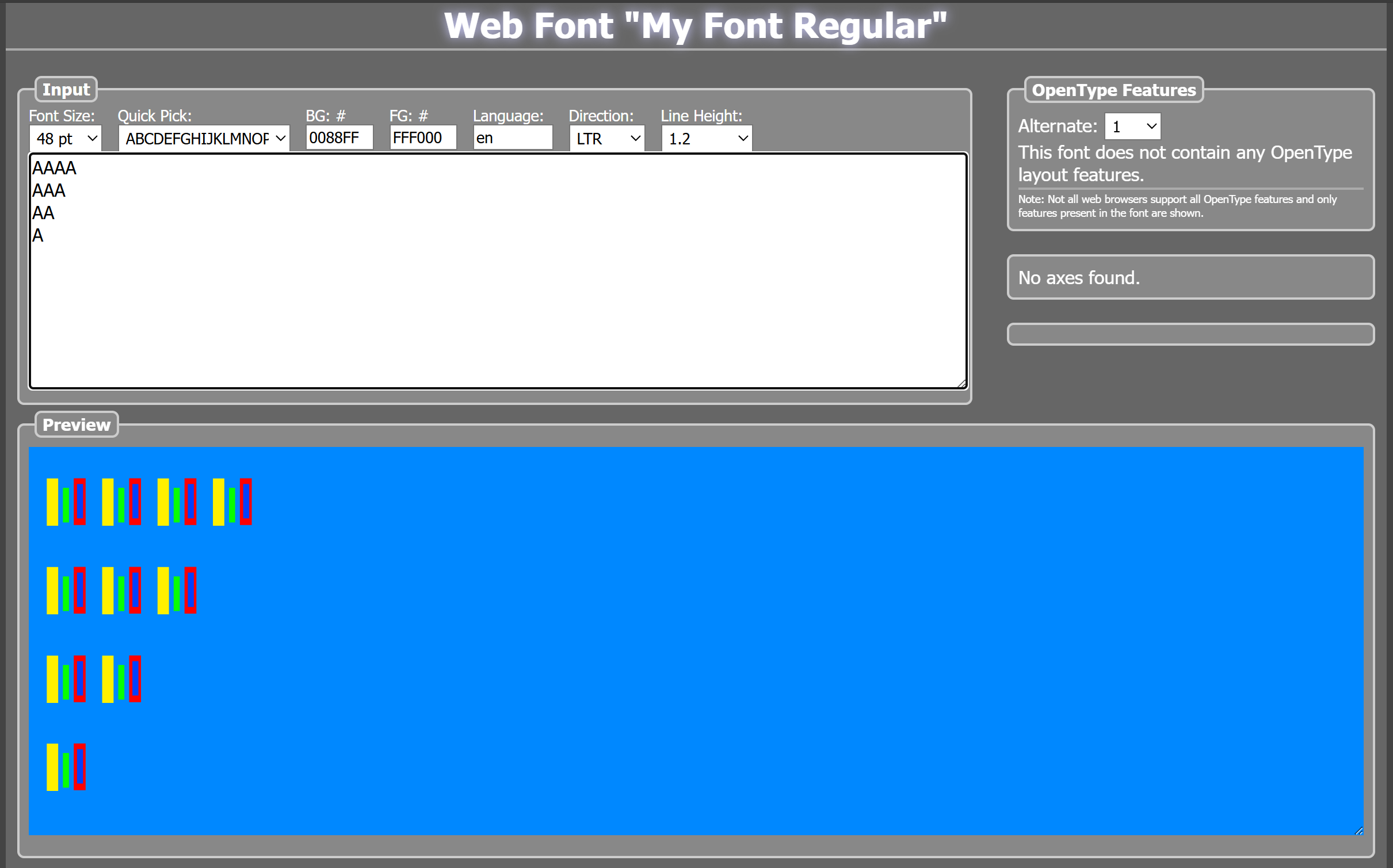 I created a test font called MyFont. I added a layed color glyph. I wanted to test the Foreground option so the user could pick the text color and have some of the glyph pre-colored and the rest user defined.