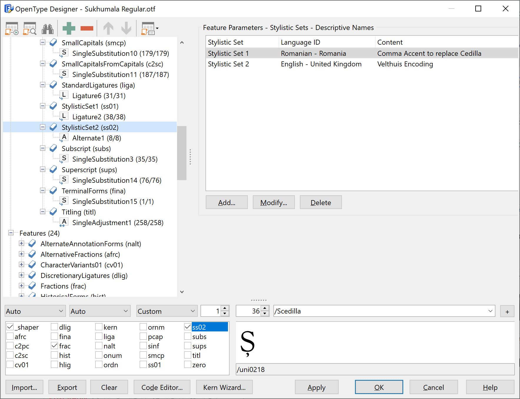 Switched descriptions of Stylistic Sets SS01 and SS02
