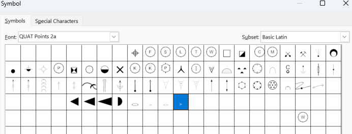 In the above screenshot, to the bottom right, is a W in a circle. I don’t see it in the font in FontCreator. I see the 66 cartographic symbol characters that I created and the summary to the right (panel) tells me that I have 66 so this W is not counted, nor is it seen.