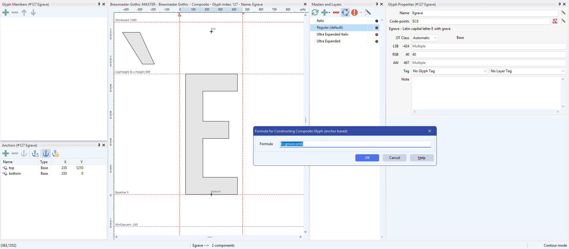 Right now we don’t know if the anchor is incorrectly placed in the E, or in the gravecomb. (I know “auto-attach” is off, but pretend that auto-attach is on and that we still have the gravecomb out of alignment). We shall need to visit both glyphs to review their anchors in order to fix this.